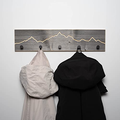 Appendiabiti in legno anticato con motivo di montagna, realizzato a mano in Baviera, appendiabiti in legno, 55 cm (5 ganci), ganci neri
