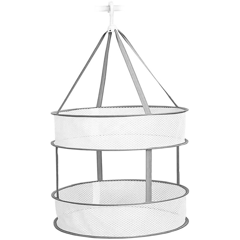 Questo prodotto intelligente è ideale per riporre vestiti o altri tessuti, ma può essere utilizzato anche come stendino per capi più piccoli. Usando il gancio in alto, puoi facilmente appendere lo stendibiancheria nell'armadio o su uno stendibiancheria. Il materiale a rete arioso fa sì che calze e biancheria intima si asciughino senza problemi sui due diversi ripiani. - Deposito di vestiti appesi - Può essere utilizzato come stendino per la biancheria intima - Due ripiani in materiale a rete arioso Specifiche: Colore: multicolore Diametro: 50 cm Altezza sul ripiano: 12 cm