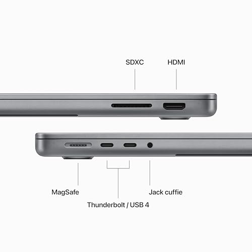 BRILLANTE DISPLAY PRO - Il display Liquid Retina XDR da 14,2" con gamma dinamica estrema ha più di 1000 nit di luminosità per contenuti HDR spettacolari, fino a 600 nit di luminosità per i contenuti SDR, e modalità di riferimento professionali per lavorare al meglio anche quando sei in giro. (Il display è un rettangolo con gli angoli superiori arrotondati;
