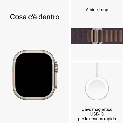 Apple Watch Ultra 2 GPS + Cellular 49mm Smartwatch con robusta cassa in titanio e Alpine Loop indaco - Large. Fitness tracker, GPS di precisione, tasto Azione, batteria a lunghissima durata