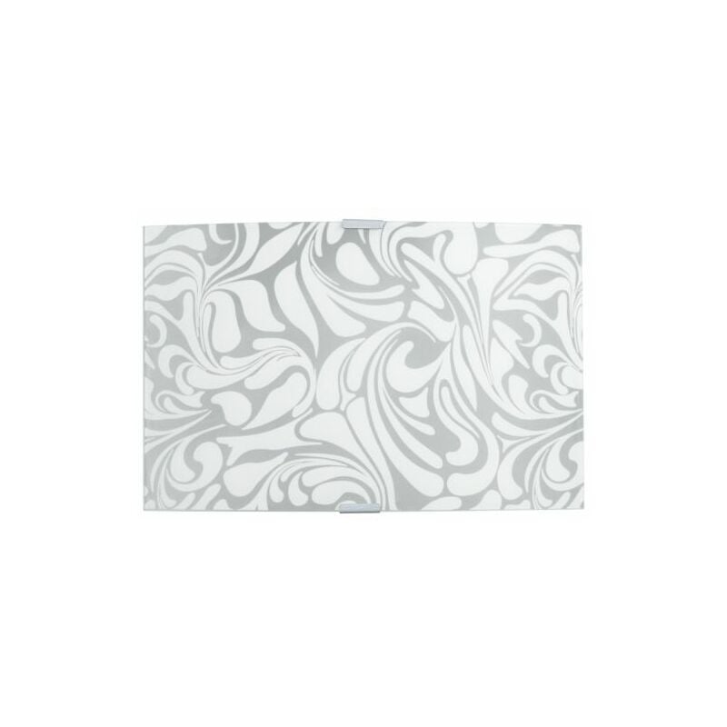 Applique per parete rettangolare con montatura in metallo verniciato argento, vetro in lastra spessore 3 mm serigrafato bianco, sabbiato esterno. Attacco E27 (grande) - 220/240V - 50 Hz - IP20. Max wattaggio lampadina 57W (non compresa).