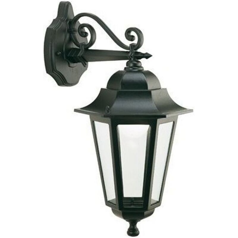 Collezione Esagonale IL CLASSICO CHE NON TRAMONTA MAI Applique per esterno a 1 luce, con struttura in pressofusione di alluminio, colore nero, rivolta verso il basso.. Diffusore in vetro trasparente. Porta lampadina (non inclusa) di altezza max 155mm. Alimentazione 230 V ~ 50 Hz. Grado di protezione IP43.