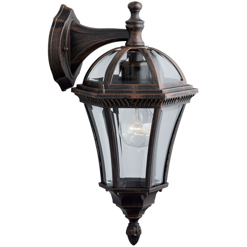 Collezione Capri CLASSICO SENZA TEMPO Una squisita staffa da parete per esterni a 1 luce con una finitura verniciata marrone rustico. Il downlight è realizzato in alluminio e vetro trasparente;