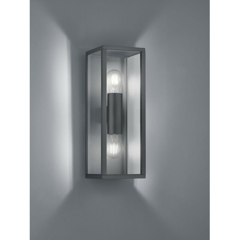 L'applique da parete GARONNE di Trio Lighting è composta da una struttura rettangolare in alluminio pressofuso di colore antracite e paralume in vetro trasparente. Dotata di 2 alloggi per lampadine E27 da max 10 watt (acquistabili separatamente), doppia emissione di luce, verso l'alto e verso il basso. Il grado IP44 offre una buona protezione contro corpi estranei e spruzzi d'acqua provenienti da qualsiasi direzione. Una lampada da parete dallo stile vintage, ideale per illuminare zone esterne alla casa, come ad esempio giardini, terrazze, garage o ingressi. Disponibile anche la versione color zinco.