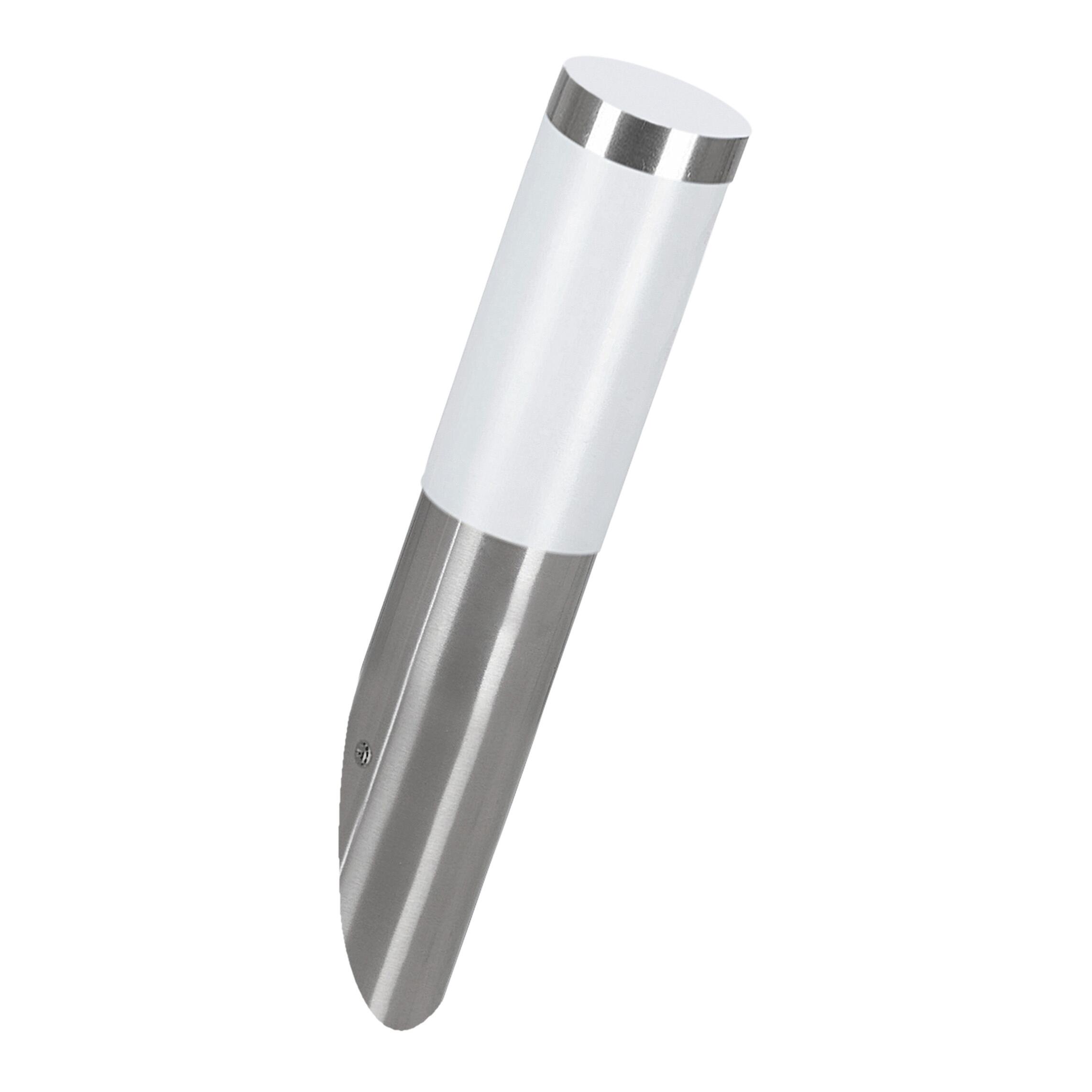 Applique da parete ascendente . Struttura / diffusore in alluminio spazzolato e policarbonato bianco. IP44 Dotazione per installazione angolare. Dimensioni: 16,50 x Ø7,5 x H39 cm