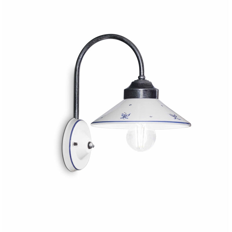 Collezione Classic Asti L'ARMONIA DEI DECORI Applique 1 Luce E27 diametro 20 cm in ceramica decoro Filo Blu con montatura Nero Sfumato Argento frutto di una lavorazione eseguita rigorosamente a mano secondo le tecniche artigianali di una volta. L'armonia di un rassicurante passato ritorna nei materiali che compongono una linea dalle forme semplici ed essenziali. Il metallo e i decori dipinti a mano sulla ceramica sottolineano la maestria del lavoro manuale degli artigiani. La personalizzazione di ogni elemento rende la linea ancor più originale. Sobria ed elegante quest'applique può fare la differenza illuminando il vostro salotto in montagna o ricreando un'atmosfera soft in camera da letto. E' disponibile anche nei colori Argento, Bianco, Bianco Sfumato Argento, Bianco Sfumato Oro, Nero, Nero Sfumato Oro, Nero Sfumato Rame, Ruggine, Verde Sfumato Oro.