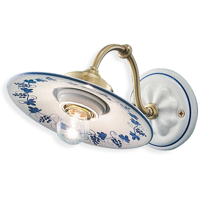 Collezione Classic Asti L'ARMONIA DEI DECORI Applique 1 Luce E27 diametro 22 cm in ceramica decoro Filo Blu con montatura Ottone Satinato frutto di una lavorazione eseguita rigorosamente a mano secondo le tecniche artigianali di una volta. L'armonia di un rassicurante passato ritorna nei materiali che compongono una linea dalle forme semplici ed essenziali. Il metallo e i decori dipinti a mano sulla ceramica sottolineano la maestria del lavoro manuale degli artigiani. La personalizzazione di ogni elemento rende la linea ancor più originale. Un elemento classico che arreda con estrema grazia qualsiasi ambiente della vostra casa in stile classico o country grazie al suo decoro con dei grappoli d'uva liberamente ispirato alla vita campestre. E' disponibile anche nei colori Argento, Bianco, Bianco Sfumato Argento, Bianco Sfumato Oro, Nero, Nero Sfumato Argento, Nero Sfumato Oro, Nero Sfumato Rame, Ruggine, Verde Sfumato Oro.