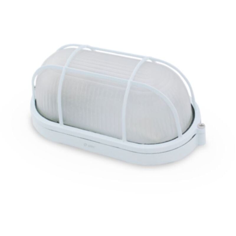 Griglia ovale Applicare alluminio Solo disponibili in bianco Tenuta: IP44 ... Con isolante, diffusore in vetro e griglia protezione. con E27. 230V Per lampadine alogene o LED.