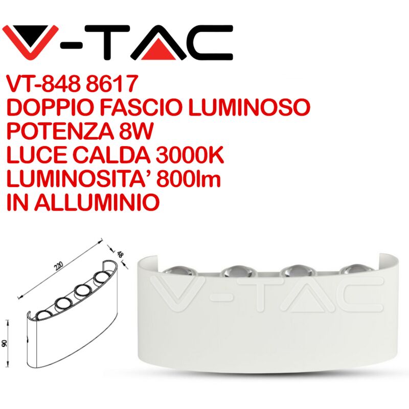Applique Led Da Parete e Muro Disegno Moderno Rotondo Curva 220V 8W 800 Lumens Bianco Caldo 3000K IP54 Doppio Illuminazione Up-Down e Indiretto Con Angolo Luce 150 Gradi Carcassa Colore BIANCO, Dimensione 220X48X80mm(LXWXH) Ideale Per Soggiorno,Camera Da Letto,Studio,Corridoio,Parete Esterno,Giardino Ect. Marca V-TAC Codice Prodotto LD8617C Dimmerabile NO Voltaggio AC220V 50/60Hz Potenza 8W Luminosità 800 Lumen CRI RA>80 Illuminazione Indiretta,UP-DOWN Angolo 150 Gradi Numero di Led 8 Power Led Da 1W Colore Bianco CALDO 3000K Impermeabilità IP54 Temperatura Emesso < 50°C Misura(mm) 220X48X80mm(LXWXH) Colore Carcassa BIANCA Durata 20000 ore Omologazione SI, CE e RoHS