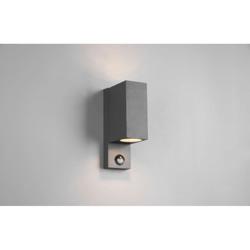 Applique da Parete Esterno con Sensore di Movimento - Roya Antracite L'applique da parete Roya di Trio Lighting è composta da una struttura squadrata in alluminio pressofuso di colore antracite. È possibile installare 2 lampadine con attacco GU10 da max 35 watt, acquistabili separatamente. Sensore di movimento integrato che accende l'apparecchio ad ogni passaggio ad una distanza di max 8 metri con un angolo di emissione di 100°. La luce viene emessa in maniera diffusa sia verso il basso che verso l'alto. Una lampada da parete perfetta per spazi esterni, grazie al grado di protezione IP44 che preserva il dispositivo da eventuali schizzi d'acqua provenienti da ogni direzione. Design semplice e moderno, da poter installare sia singolarmente che in collocazione multipla, ad esempio per illuminare un ingresso, una facciata, una veranda, un garage o una zona giardino. Caratteristiche: Struttura squadrata in alluminio pressofuso Colore antracite Possibilità di installare 2 lampadine GU10 da