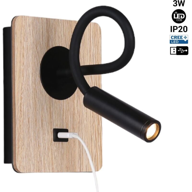 L'applique da parete LONDON USB è stata appositamente progettata come lampada da lettura per la testata del letto. È dotata di un braccio flessibile regolabile, di un faretto LED 3W e di una porta USB per collegare qualsiasi dispositivo compatibile. Emette luce in una tonalità bianca calda (2800K) con un flusso luminoso di 450 lm. Si distingue per le finiture di alta qualità e per il tocco caldo dato dal legno. Disponibile in bianco e nero.