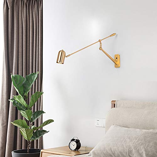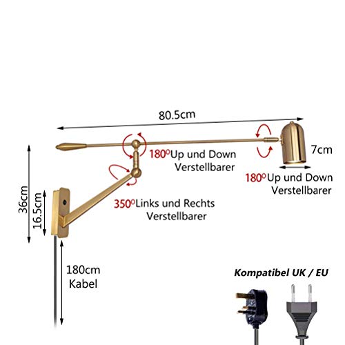 Applique da parete Retro con Interruttore, Lampada da parete Orientabile a Braccio Lungo in Metallo, Spot da parete Interno con Spina, Cavo da 1,8 M, GU10, per Salotto Camera da letto Lettura,Ottone