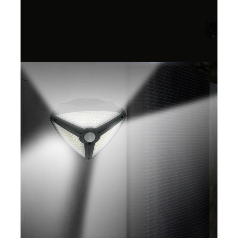 2 faretto solare 138 led applique parete con sensore di movimento crepuscolare Descrizione La nuova lampada a led ricaricabile con pannello solare, 3 funzioni 3 tonalità di luce soffusa normale e molto forte. Utile per giardini, pergolati, viali giardini sotto porte, o altre zone che sono in totalità di buio. Grazie ai suoi 150 LED, si ricarica tramite il pannello solare, ed il suo sensore di movimento si accende in presenza di persone o movimenti. Può essere selezionato anche come sempre acceso con luce soffusa. Il pannello superiore solare è da 27W, per la massima carica posizionare il prodotto dove riesce a prendere luce diretta. Le 3 funzioni vi permettono di interagire, e settare il prodotto a seconda delle vostre esigenze di luce. Utilizzo del prodotto Modalità 1, premere per 1 secondo per entrare nella modalità 1 con sensore di movimento attivato al passaggio di persone o animali o movimenti, durata 15 secondi. Modalità 2, sensore di movimento al passaggio con modalità bassa