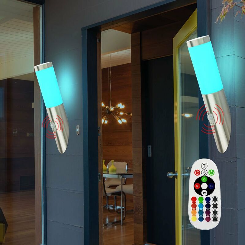 Descrizione Lampada da parete moderna per uso esterno. Ottima fattura, aspetto elegante e finitura nobile: queste sono le caratteristiche di questa lampada di design. Questa lampada è progettata secondo la classe di protezione IP44 ed è anche realizzato in acciaio inossidabile e in plastica robusta. Pertanto, è a prova di polvere e spruzzi d'acqua e quindi predestinata per l'uso esterno. Dotata di un rilevatore di movimento, questa lampada ti offre una maggiore sicurezza Grazie a diversi colori, puoi decidere se vuoi aumentare l'atmosfera nel tuo giardino, ravvivare il tuo terrazzo o dare un tocco al tuo giardino aiuto di stile. Con il telecomando incluso puoi accendere e spegnere facilmente la tua luce di design e regolarla. Una luce LED RGB di alta qualità a risparmio energetico anche la sorgente Sono inclusi un telecomando per la luce bianca e il controllo RGB . La fornitura include 2 applique! Dettagli lampada • tipo di lampada: lampada da parete • Cornice: acciaio inossidabile