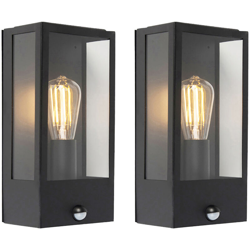 QAZQA Set di 2 lampade da parete per esterni nere con rilevatore di movimento - Rotterdam Non rimanere mai più al buio all'esterno con questo bellissimo set di 2 lampade da parete per esterni. Rotterdam è di colore nero ed è realizzata in acciaio inossidabile con vetro. Le lampade da parete hanno ciascuna una profondità di 11 cm, un'altezza di 33 cm e una larghezza di 16 cm. Attenzione: queste lampade da parete vengono fornite senza lampadine. Quindi dovrai ordinarle separatamente. Con un valore IP di IP44, queste lampade da parete sono a prova di spruzzi e quindi adatte per essere posizionate contro la casa o la recinzione. Grazie al sensore di movimento, la lampada si accende automaticamente quando qualcuno si trova nelle vicinanze. Rendi accogliente il tuo spazio esterno con questo set alla moda! Portalampada: E27 . Max 1 x 60 W, 230 V Adatto a: LED Voltaggio: 220V/230V IP Classe di protezione: IP44 Funzioni extra: Non regolabile, Sensore di movimento inclusivo,No, senza cavo e