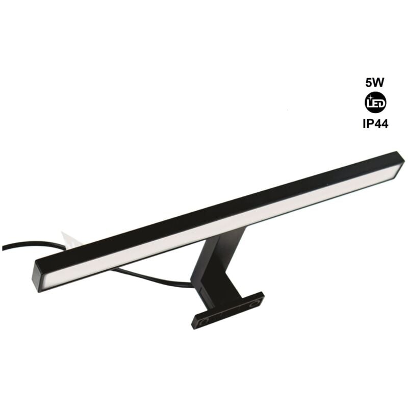 Applique da bagno dal design moderno e dalle dimensioni ridotte, in nero opaco. Può essere installata in due modi: incassata nello specchio o avvitata al mobile del bagno. Ha una potenza luminosa di 5W, un CRI>80 e un grado di protezione IP44, che ne garantisce la durata in ambienti molto umidi e la rende resistente anche agli schizzi. È disponibile in bianco neutro (4000K).