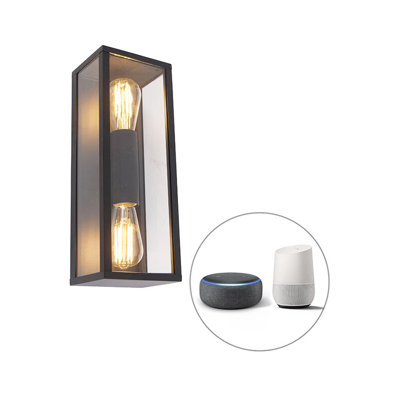 QAZQA Lampada da parete intelligente nera 38 cm 2 luci IP44 incluso Wifi ST64 - Charlois La lampada da parete per esterni Charlois conferisce al tuo giardino quel tocco in più. Questo oggetto di design è realizzato in alluminio e rifinito in nero. È quindi perfetto per un giardino di design. Grazie ai 2 punti luce, fornisce sempre luce a sufficienza. Charlois ha una lunghezza di 14 cm, una larghezza di 13,5 cm e un'altezza di 38 cm. La lampada da parete per esterni ha un grado di protezione IP44. È quindi adatta per aree esterne riparate. La lampada da parete per esterni ha un flusso luminoso massimo di 806 lumen, il che la rende un vero e proprio concentrato di potenza! La lampada da parete per esterni viene consegnata a casa tua con le lampadine E27 incluse. Consumano 7 watt e durano in media 15.000 ore di funzionamento. Un'ulteriore comodità: Charlois è intelligente e può quindi essere azionata da remoto con lo smartphone o con il sistema di domotica. Questa lampada da parete per