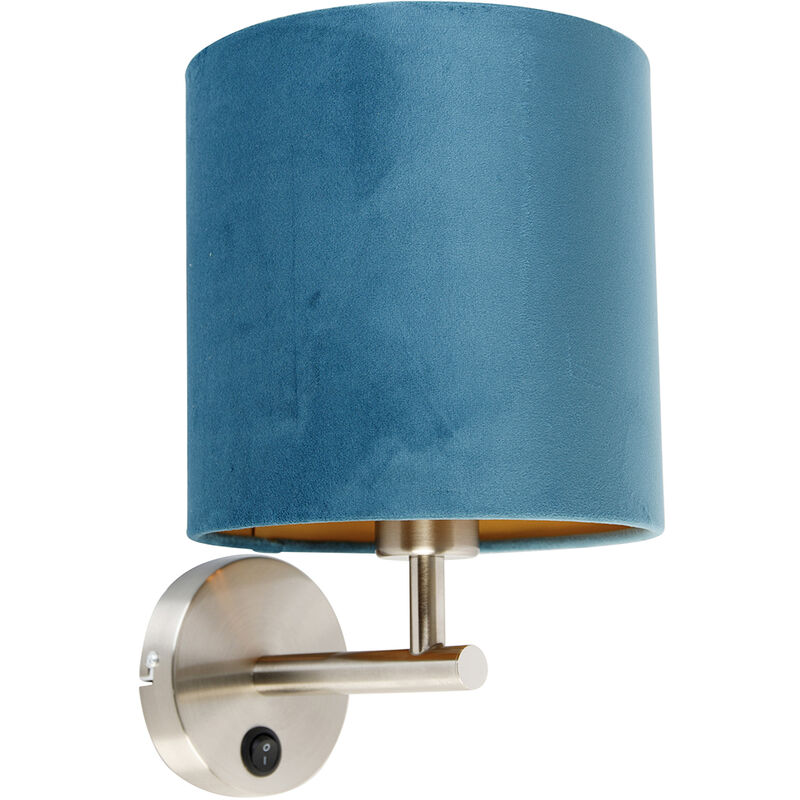 QAZQA Applique acciaio paralume velluto blu - MATT Diamo un tocco di classe! Questa applique cilindrica è perfetta per dare alle tue pareti un look vintage. La combinazione del paralume in velluto blu e del corpo in acciaio rende l'applique davvero unica. La lampada ha una profondità di 23 cm e un'altezza di 32 cm. Il paralume ha un diametro di 20 cm e un'altezza di 20 cm. La piastra di montaggio ha un diametro di 11 cm. Puoi completare la lampada con una lampadina con attacco E27 (max. 60W), da ordinare separatamente. La lampada è dimmerabile con un dimmer esterno (dimmer non incluso). La tua casa sarà davvero completa solo con questa originale applique! Portalampada: E27 . Max 1 x 60 W, 230 V Adatto a: Incandescente, Algogene, LED,Risparmio energetico Voltaggio: 220V/230V IP Classe di protezione: [IP20] A prova di polvere Funzioni extra: Regolabile: Dimmer escluso,No, senza cavo e spina Lampadine exclusiva Il QAZQA Applique acciaio paralume velluto blu - MATT è Blu. Gli spazi