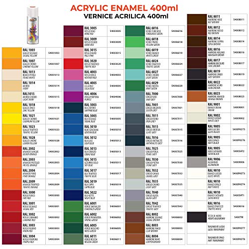 100% ACRILICO - A Casa riceverete uno smalto spray 100% acrilico multiuso in formato da 400 ml a rapidissma essicazione. Smalto brillante con cappuccio di sicurezza brevettato child-proof, per interni ed esterni, essicca al tatto in circa 15 minuti ed in profondità dopo circa 22 ore. Odore caratteristico di solvente, ideale per diverse applicazioni quali superfici in legno, metallo, vetro, ceramica, porte e mille altri oggetti. E' disponibile in piu di 100 colori RAL!