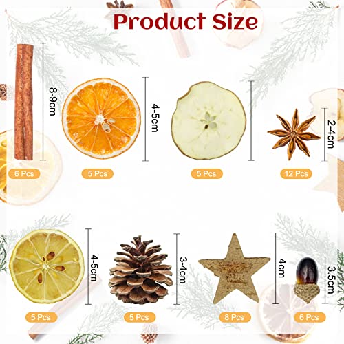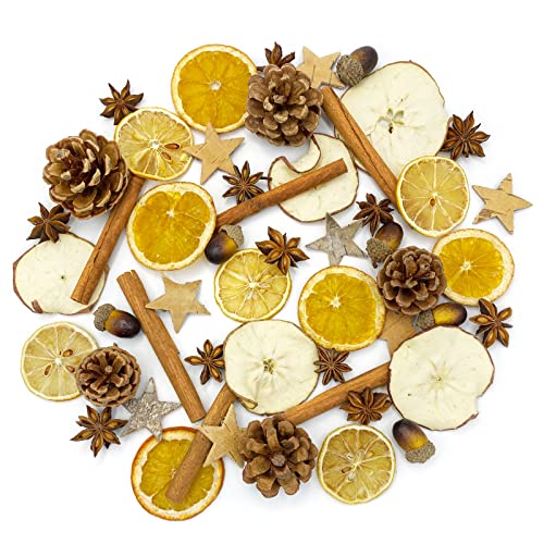 【Potpourri Natale】: Potpourri Set natalizio composto da 5 pezzi di pino d'olio da 3 - 4 cm, 6 ghiande, 12 pezzi di anice stellato, 6 pezzi di rotoli di cannella, 5 fette di arancia, 5 fette di limone, 5 pezzi di intaglio di mele, 8 stelle in corteccia di betulla (totale 52 pezzi).