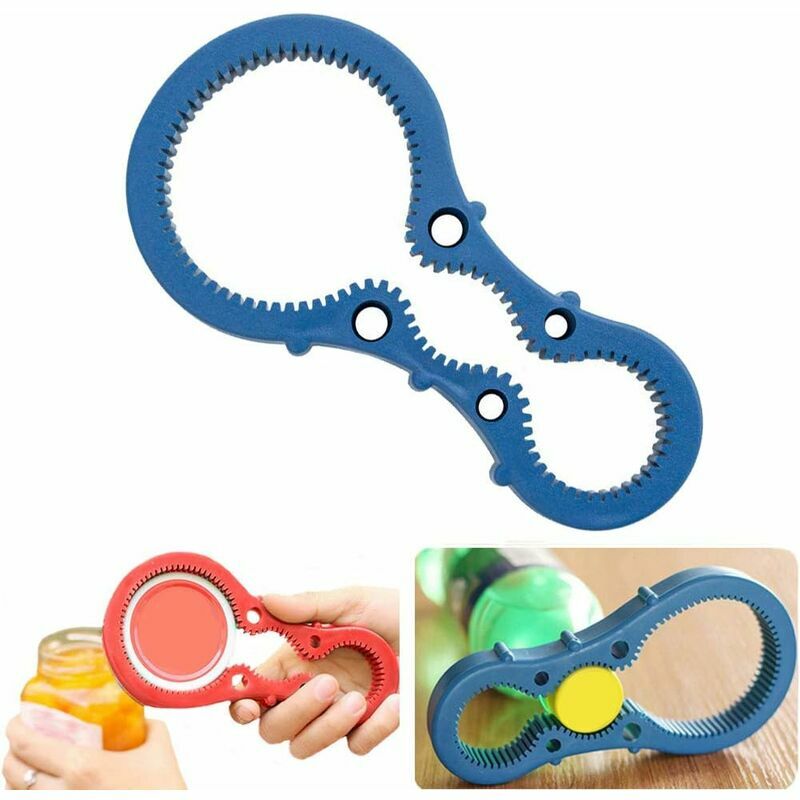 Apribarattolo - Apri facilmente il barattolo con una semplice rotazione. Puoi aprire facilmente la maggior parte delle piccole bottiglie d'acqua e barattoli di vetro a bocca larga con questo apribarattoli. Utilizza un meccanismo a ingranaggi per tenere la lattina o il coperchio. Puoi fare a meno della tovaglia o di strumenti ingombranti. Il cuscinetto antiscivolo offre una presa migliore durante l'apertura di barattoli ostinati e impedisce agli oggetti di scivolare anche con le mani bagnate. Strumenti apri barattoli che fanno risparmiare manodopera per i picnic in cucina. chi ne ha bisogno Apribarattoli per mani deboli Apribarattoli per anziani con artrite Specifiche: Materiale: gomma. Colore: blu Peso netto: 70 g Dimensioni: 15,5*7,5/ 5,9*2,0 cm
