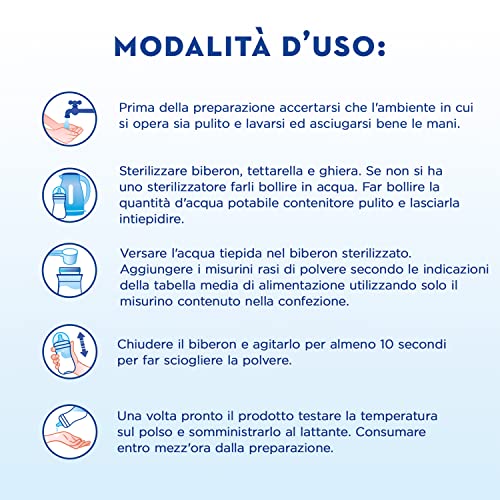 AVVERTENZA: Per la salute del bambino seguire con cura le indicazioni per la PREPARAZIONE e la CONSERVAZIONE indicate nella confezione. Accertarsi che l'ambiente in cui si opera sia pulito. Una volta pronto il prodotto testare la temperatura sul polso e somministrare al bambino entro mezz'ora dalla preparazione