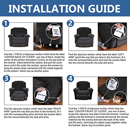【Ottima vestibilità】Le fodere elastiche per sedie reclinabili includono 2 pezzi di fodera per braccioli, 1 pezzo di fodera per poggiapiedi e 1 pezzo di fodera per schienale. Il design in 4 pezzi è più adatto della fodera in 1 pezzo, non è necessario rimboccare il tessuto extra con bastoncini di schiuma, risparmiando tempo di installazione