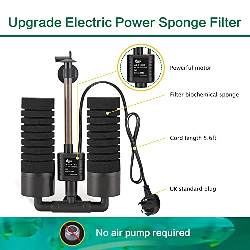 AQQA Filtro a doppia spugna per acquario, 3 W/5 W silenzioso filtro per serbatoio di pesce, filtro sommergibile in schiuma con 4 spugne, 1 sacchetto di sfere in ceramica bio filtrate (M)