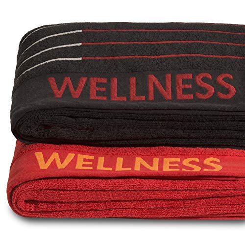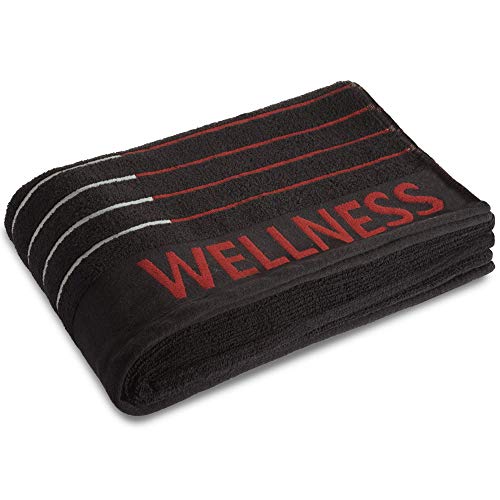 Questo asciugamano di marca Granada è disponibile nei colori rosso o nero con un motivo senza tempo e una scritta "Wellness". Versatile grazie alle dimensioni ottimali