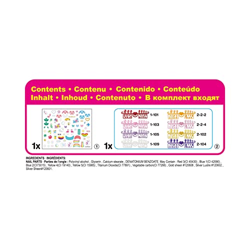 Segui l'immagine sulla confezione per realizzare graziosi disegni per unghie con motivi come nastro, cuore, unicorno, fiore, fenicottero e molto altro, che possono essere realizzati assemblando le unghie e le decorazioni Aquabeads incluse con l'acqua del rubinetto