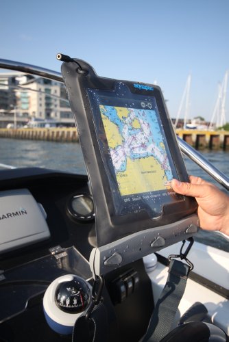 Custodia subacquea e impermeabile realizzata in polimero per iPad Air con cinghia regolabile, inattaccabile da acqua e agenti esterni come polvere o sabbia.