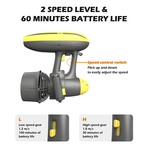 Propulsione potente: Propulsione a velocità fino a 1,8 m/s (4,0 mph), quasi rispecchiando il record femminile di campioni del mondo freestyle di 100 m. MagicJet raggiunge una spinta straordinaria con il suo potente motore singolo, superando le capacità di propulsione degli scooter subacquei a doppio motore.