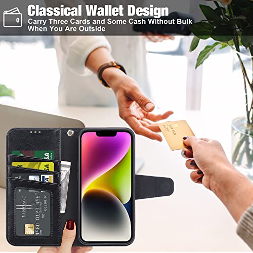 Arae Compatibile con iPhone 14 Custodia Portafoglio Flip Cover con Porta Carte e Cinturino da Polso per iPhone 14 6.1 Pollici, Nero