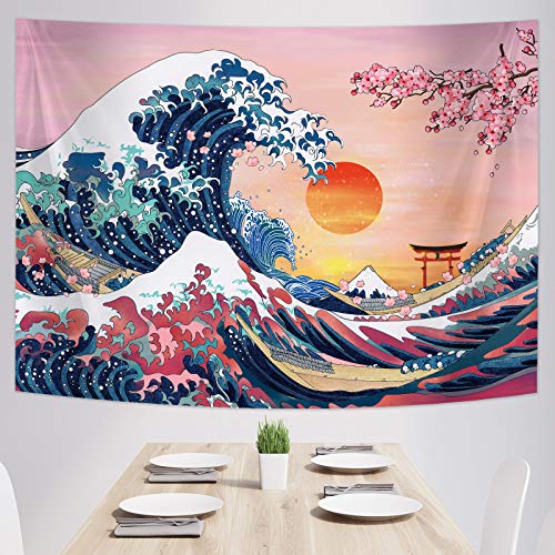 Arazzo Grande Giapponese con Stampa di Onda dell'Oceano Albero di Ciliegio Fiore Montagna e Tramonto Sfondo Kanagawa Decorazioni da Appendere a Parete per Camera da Letto Soggiorno (150 x 200 cm)