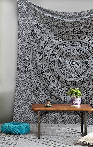 Arazzo da parete, stile indiano, hippie, decorazione bohemian, psichedelico, elefante, mandala, colore bianco e nero, dimensioni queen size 213 x 228 cm circa