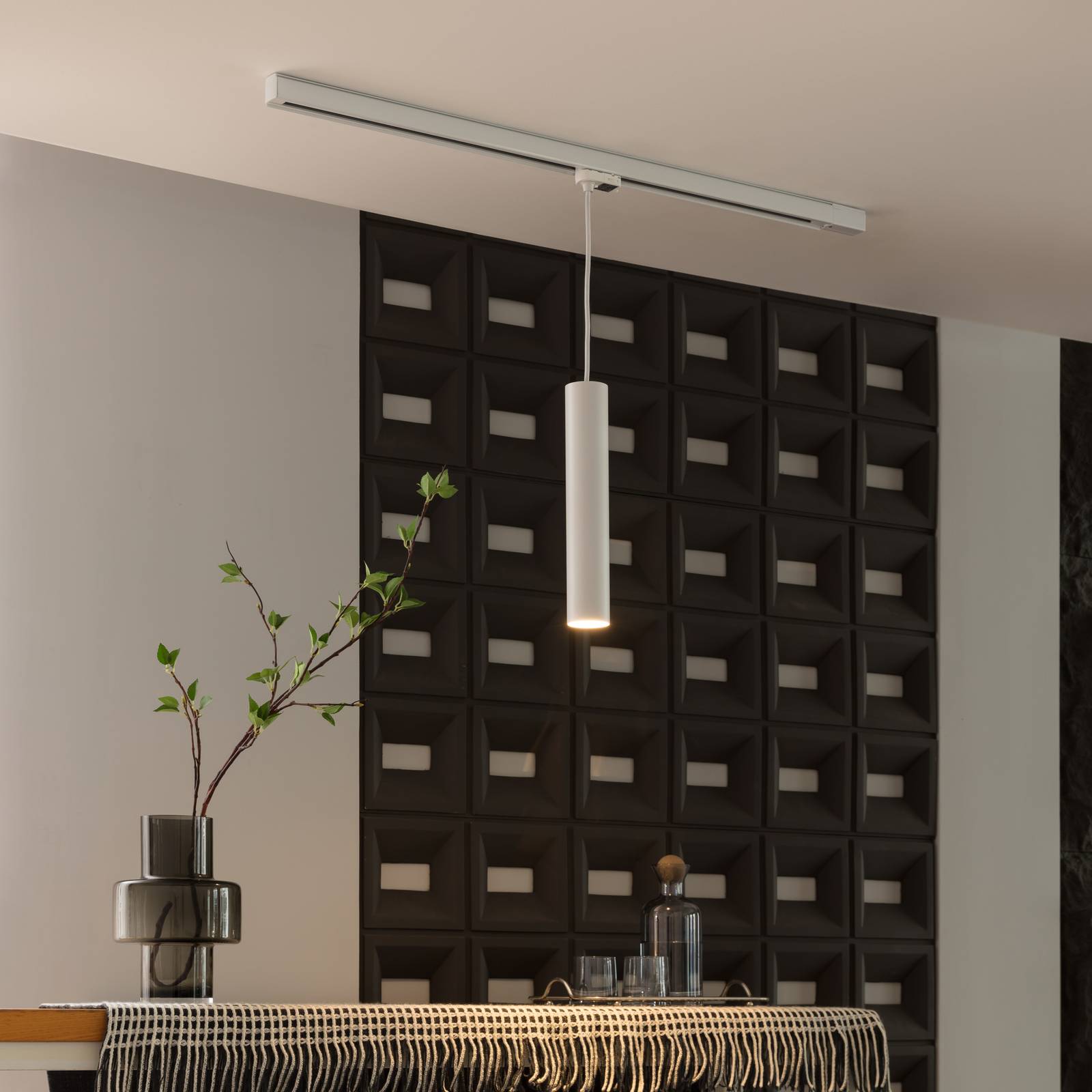 Lampada a sospensione Ejona bianca per binario trifase, forma cilindrica rotonda La lampada a sospensione Ejona è progettata per il funzionamento con un sistema binario trifase e dispone di un portalampada GU10 che può essere equipaggiato individualmente con una sorgente luminosa adeguata. Sono disponibili diversi colori di luce e angoli di emissione, per esempio, in modo che non ci siano praticamente limiti all'uso in spazi abitativi privati o locali commerciali e si possa creare la giusta illuminazione. La superficie bianca del paralume metallico rotondo a forma stretta è sinonimo di un'espressione armoniosa e senza tempo e si adatta a molti ambienti.