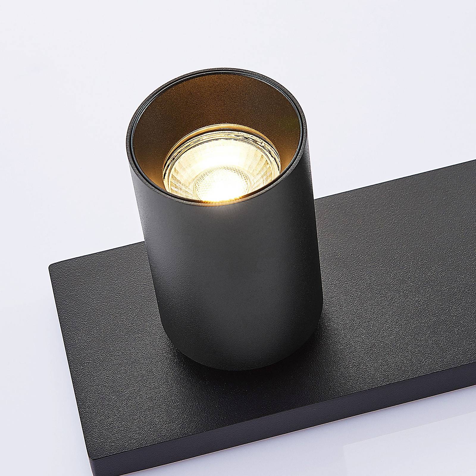 Lampada a faretto Brinja nera in alluminio La lampada Brinja nera è composta da due faretti cilindrici, entrambi inclinabili di 90 gradi e ruotabili di 350 gradi. I faretti sono fissati a una staffa rettangolare e possono essere inclinati in diverse direzioni per illuminare diverse parti della stanza. Realizzata in alluminio di alta qualità, la lampada dal design senza tempo si adatta a molti stili di arredamento. Che si tratti di un grande soggiorno o di un piccolo ufficio, gli eleganti faretti forniscono un'illuminazione d'atmosfera a qualsiasi ambiente.