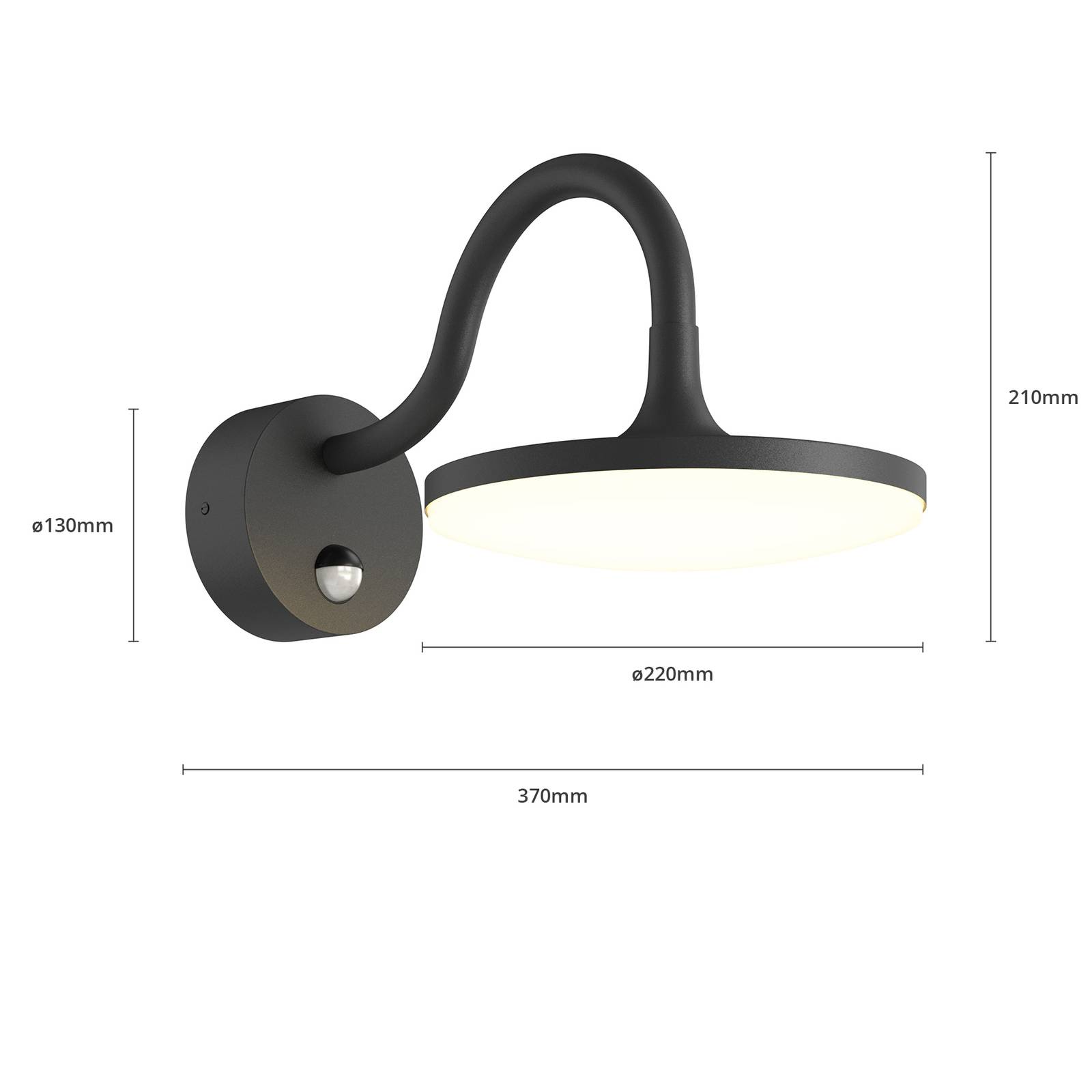 Lampada da parete a LED per esterni Fineria con rilevatore di movimento La luce dei LED bianchi caldi dell'apparecchio da esterno a parete Fineria si irradia nell'ambiente circostante con un ampio angolo di emissione, ogni volta che è necessario, perché l'apparecchio è dotato di un rilevatore di movimento PIR integrato. L'apparecchio di illuminazione in alluminio di colore grigio scuro, dal design elegante, si adatta a quasi tutte le facciate e si accende ogni volta che viene rilevato un movimento ad una distanza da 6 a 10 metri ed entro un campo di rilevamento di 120°. La durata dell'illuminazione può essere regolata da 5 secondi a 10 minuti e anche la luminosità di risposta può essere regolata (15 - 2.000 lux). L'altezza di montaggio ottimale dell'apparecchio è compresa tra 0,5 e 2,5 metri.