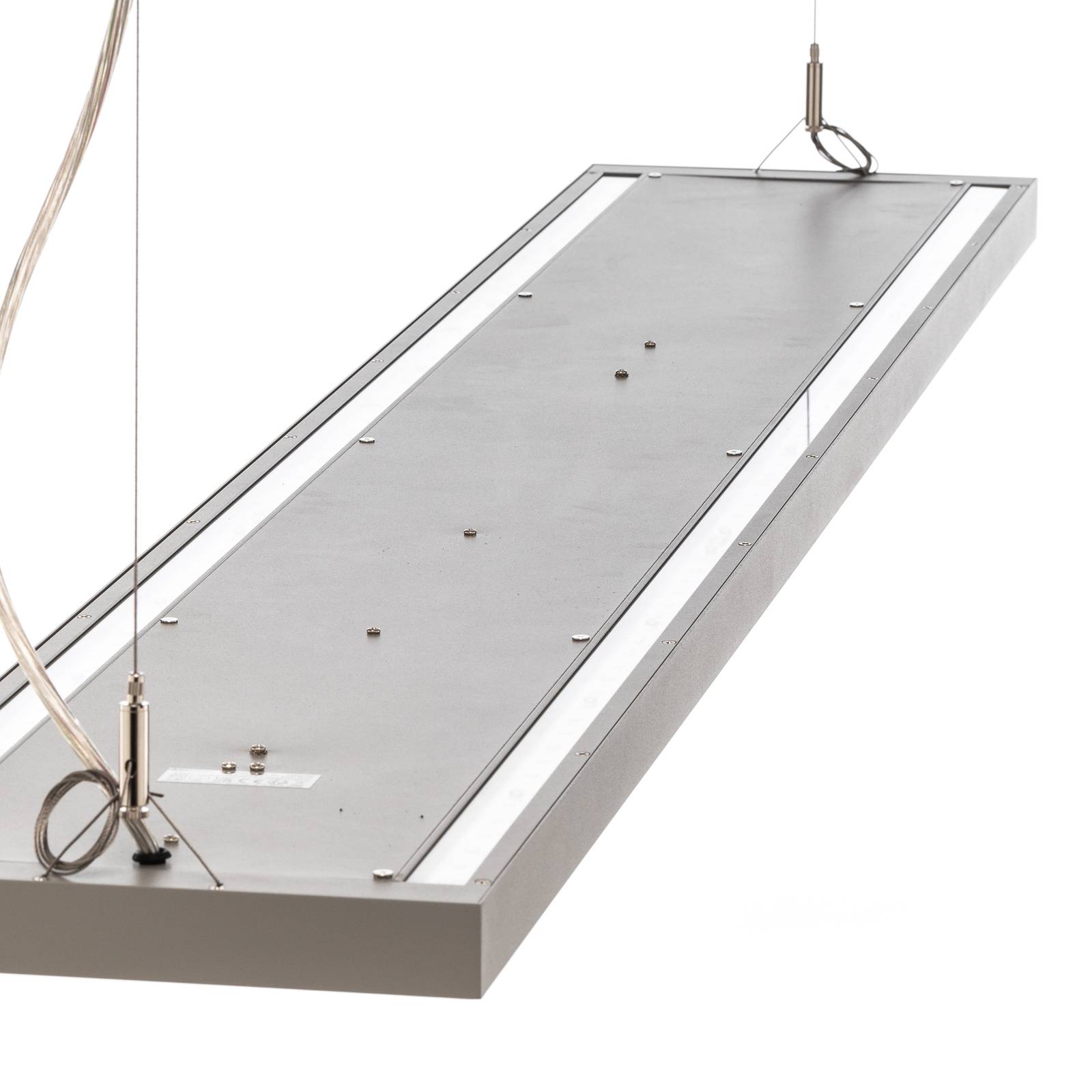 Lampada a sospensione angolare Finix LED in alluminio e plasticaQuesta lampada a sospensione LED fa risplendere le vostre quattro pareti con un nuovo splendore. L'apparecchio è dimmerabile DALI, quindi può essere regolato in luminosità con un sistema di dimmerazione compatibile. Si adatta perfettamente all'ufficio o allo studio. Questa lampada a sospensione combina tutte le qualità e i punti di forza che il marchio Arco porta con sé. L'apparecchio, presentato nel colore argento, convince per il suo design moderno e svolge una funzione decorativa anche da spento.Caratteristiche tecniche- adatta a postazioni di lavoro con schermo di computer grazie al basso valore di abbagliamento (UGR