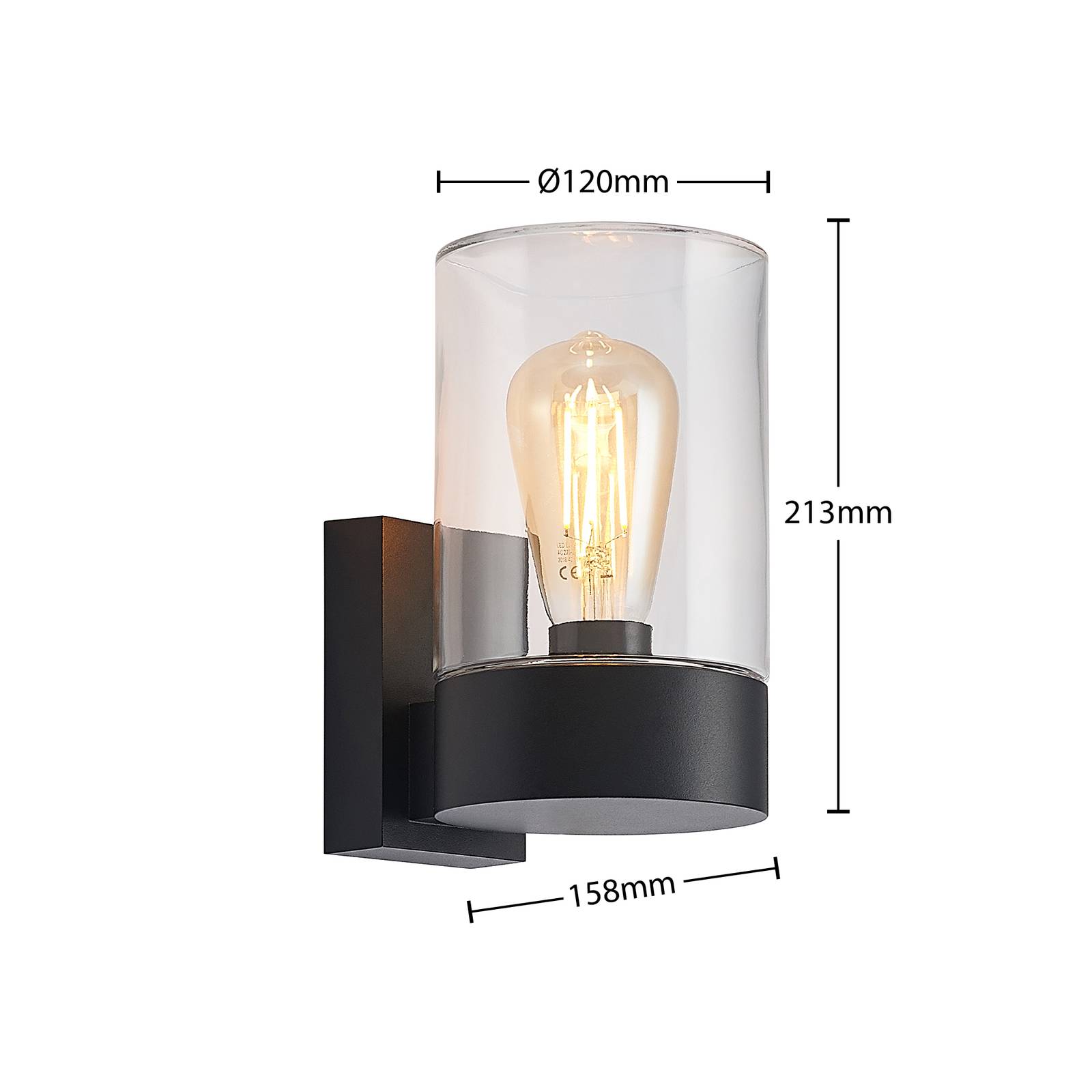 Lampada da parete nera per esterni Liljana con paralume in vetro cilindrico, IP65 Liljana è un elegante oggetto di illuminazione esterna che può essere montato su varie facciate e murature. La lampada da parete per esterni ha un corpo in alluminio di colore nero e inoltre è dotata di un paralume in vetro trasparente di forma cilindrica rotonda, che completa armoniosamente il design. Questo design assicura anche che l'illuminante sia particolarmente visibile, motivo per cui si dovrebbe prestare maggiore attenzione ad una lampada adatta. Le lampade a LED con tecnologia a filamento sono una raccomandazione molto buona qui, sia in termini di consumo di energia che di ottica. Il grado di protezione IP65 è sinonimo di alta protezione contro le intemperie e sia l'umidità che lo sporco possono difficilmente danneggiare l'apparecchio all'esterno.