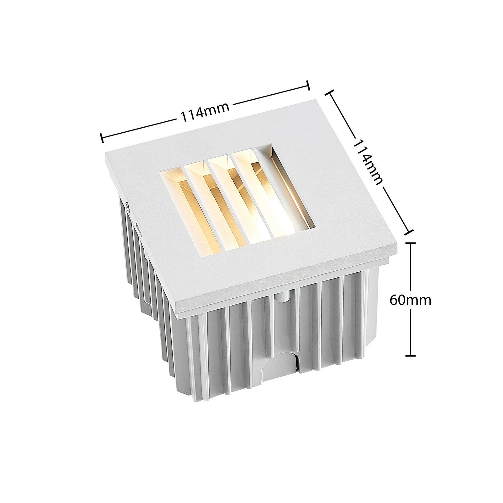 Apparecchio da incasso a parete Makio bianco in alluminio con design angolare Chi cerca un'illuminazione elegante per le scale non rimarrà deluso dalla lampada da parete a incasso Makio. È realizzato in alluminio e, una volta installato, scompare quasi completamente nella parete, lasciando solo un quadrato compatto. L'illuminazione può essere adattata alle esigenze personali selezionando la sorgente luminosa appropriata e permette di scegliere liberamente il colore della luce. Se la lampada da incasso a parete Makio viene abbinata ad altri apparecchi della sua serie, è possibile creare un'impressione complessiva armoniosa. La classe di protezione IP65 lo protegge in modo evidente da polvere e getti d'acqua e ne consente l'utilizzo anche all'esterno.