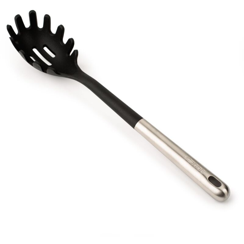 Il cucchiaio da spaghetti dede silicone de in nero e 337 mm, con il suo design flessibile e leggero, è un utensile indispensabile in cucina. Si usa per servire tutti i tipi di pasta. FLESSIBILE E FORTE: è realizzato in silicone e acciaio inox che ricopre l'intero interno conferendogli una grande flessibilità e resistenza. Ha punte sul cucchiaio per facilitare la presa degli spaghetti e di tutti i tipi di pasta . FACILE PULIZIA: questo mestolo in silicone è resistente alle alte temperature (fino a 240°C) e ai leggeri urti. Inoltre, può essere pulito sia in lavastoviglie che a mano. Misura 337 mm de lunghezza e ha un peso leggero, che consente un facile uso . DESIGN: offre una presa comoda cheimpedisce lo scivolamento aquando della cottura. È dotato di un foro de per appenderlo e riporlo comodamente in qualsiasi punto della cucina. Il colore nero e il manico grigio conferiscono un tono elegante alla cucina. Si combina perfettamente con la gamma di padelle di SamoaArcos. ARCOS