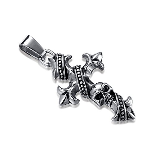 Arco Iris Jewelry Acciaio Inossidabile Collana con Pendente da Uomo, Cranio, Teschio con Fleur-De-Lis Croce, Gotico, Ciondolo con Catena a Maglia Tonda