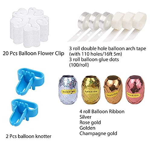 Il kit di ghirlanda con arco a palloncino viene fornito con 3 strisce di decorazione a palloncino (con 110 fori/110 piedi 5M, doppio foro), 2 pezzi nodo a palloncino, 3 punti di colla a palloncino (100/rotolo) e 20 pezzi convenienti clip a palloncino, nastro a 4 rotoli (10 m/rotolo).