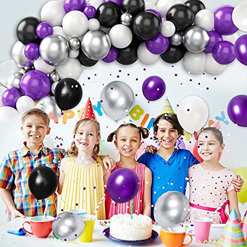 Kit arco palloncini viola: 1 palloncino bianco da 18 pollici, 2 palloncini neri, palloncini da 30,5 cm, 6 pezzi in argento, 30 pezzi bianchi, 25 pezzi viola, 10 pezzi neri, 12,7 cm, 20 pezzi in argento, 10 pezzi bianchi, 10 pezzi neri, 10 pezzi, 1 catenina per palloncini., 1 x punti di colla, 1 x nastro.