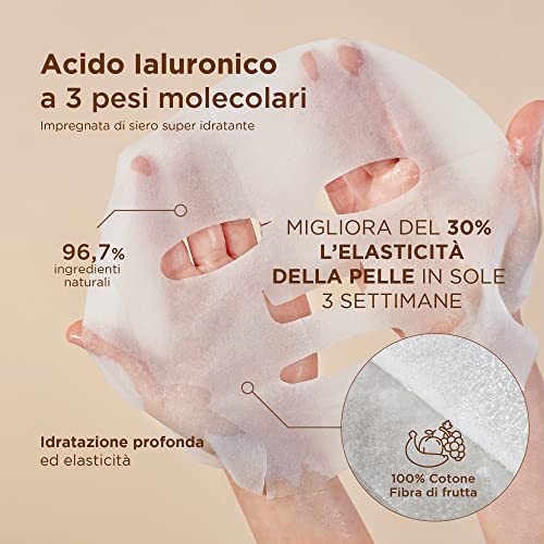 Maschere per il viso che riducono le rughe e aumentano l'elasticità della pelle grazie alle proprietà del pontente Acido Ialuronico Viso a 3 pesi molecolari che idrata tutti gli strati della pelle, sia esterni che interni