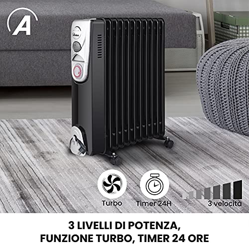 Ardes AR4R11BT Radiatore a Olio Elettrico con 11 Elementi, 3 Potenze, Timer e Vano Avvolgicavo, 2500 W, Nero/Argento