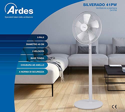 Ardes AR5D41PW SILVERADO 41PW Ventilatore a Piantana 5 Pale 40 cm Dorate 3 Livelli di Velocità Oscillazione Automatica Dettagli Silver, Bianco/Argento