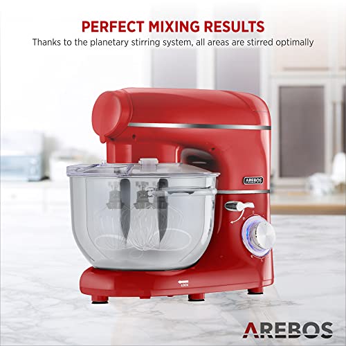 Arebos 6-in-1 Impastatrice Robot da Cucina Multifunzione 1500W |Rosso |Tritacarne |Ganci per pasta |Shaker da 1,5L |6 livelli | Terrina in Acciaio Inox 5,5 litri | Impastatore Planetario Professionale