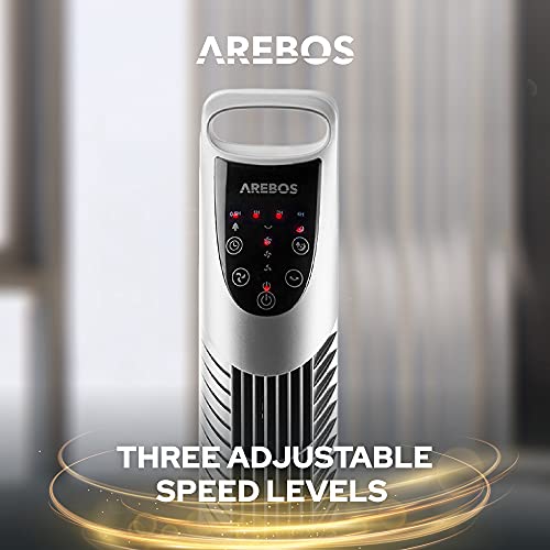 AREBOS Ventilatore a torre con telecomando e timer | 40 Watt | Oscillazione 75° | Ventola con 3 impostazioni di velocità e modalità di sospensione | Approvato TÜV GS | Argento